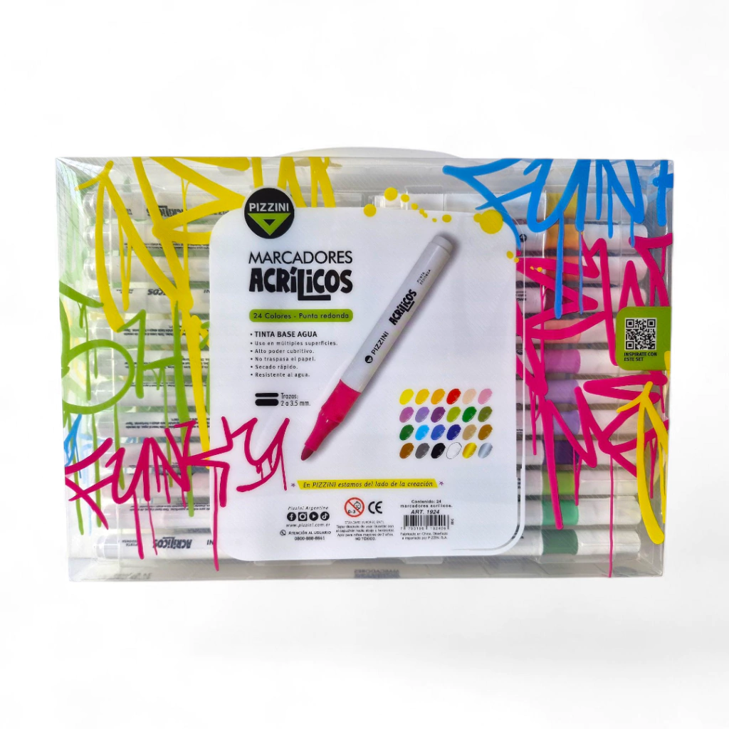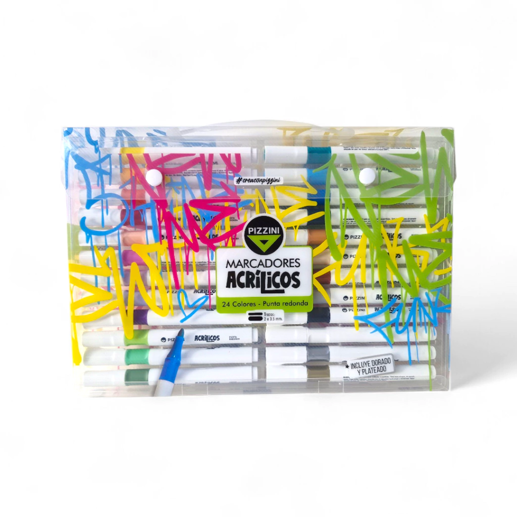 Descubrí los Marcadores Acrílicos Pizzini x24 con punta redonda, ideales para proyectos creativos y artísticos. Su secado rápido y fórmula resistente al agua garantizan durabilidad y colores vibrantes en cada trazo. Perfectos para pintar sobre diversas superficies, ofrecen un acabado profesional y fácil de usar. Sumá calidad y versatilidad a tus creaciones con este set completo.
