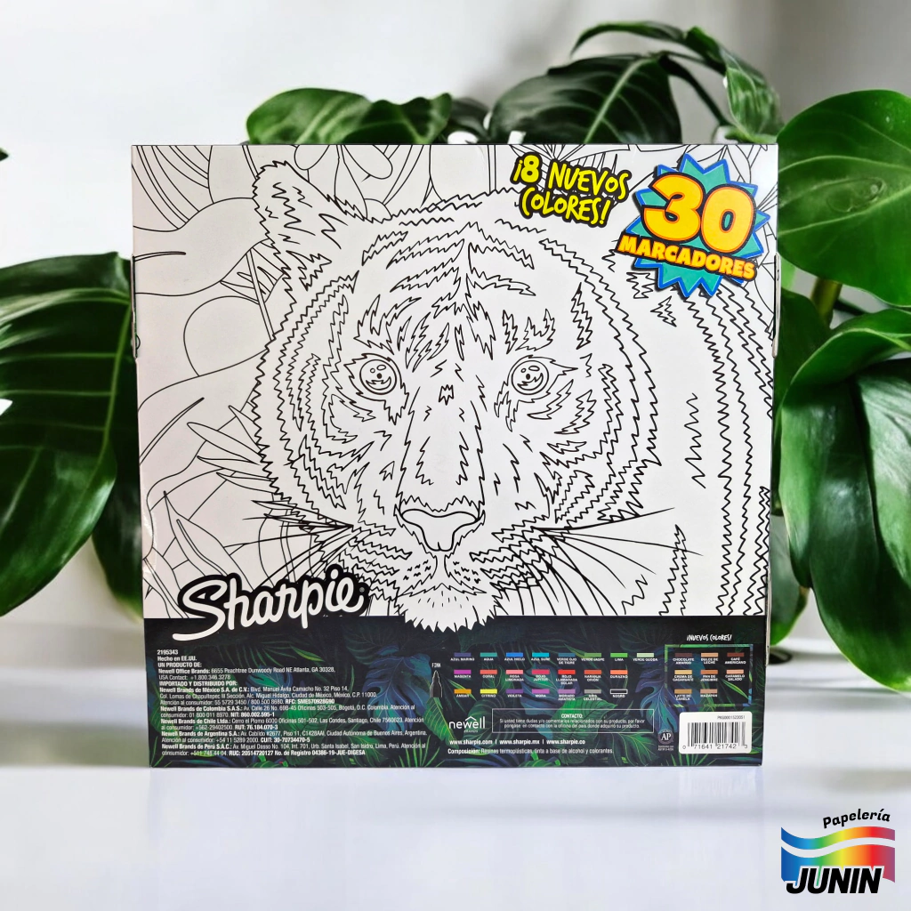 Esta hermosa caja incluye 15 Marcadores Sharpie permanente punta fina,15 resaltadores Sharpie y 4 hojas de stickers vintage para colorear.