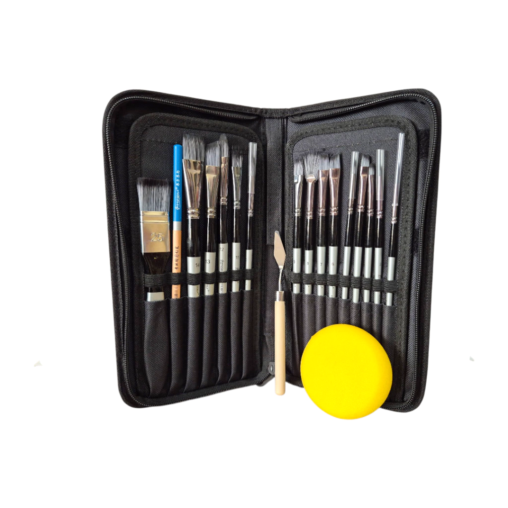 Descubrí el Set de Pinceles en Estuche con Cierre, ideal para artistas y aficionados que buscan calidad y comodidad. Este hermoso set contiene 14 pinceles chatos, una esponja redonda, una pinceleta n° 25, un lápiz negro y una espátula.